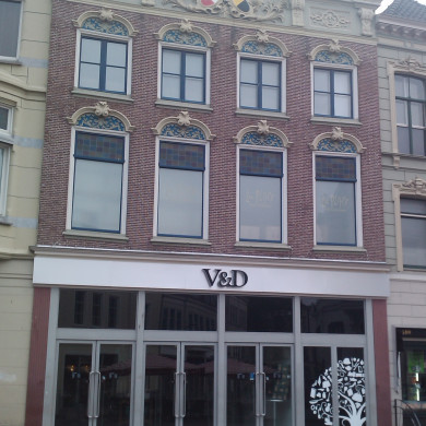 De GEVEL van "Magazijn de Zon" is in 1905 in Art Nouveau stijl gebouwd naar ontwerp van F.M.J. Caron. Hij was aan het begin van deze eeuw samen met J. Kuijt een van de vaste ontwerpers van wat later de warenhuisketen Vroom & Dreesmann zou gaan heten.