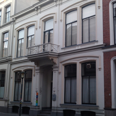 Pand dat deel uitmaakt van een in het derde kwart van de 19e eeuw als een symmetrisch geheel ontworpen straatwand. Drie traveeën brede lijstgevel met cordonbanden en vensteromlijstingen in pleister. De vensters van de verdieping zijn voorzien van zonneweringen.