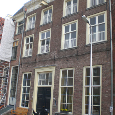 Onderkelderd huis met geverfde lijstgevel. Een geleding in de lijst overeenkomend met de vensterindeling van de topverdieping. Hijsbalk. Middenvenster zolderverdieping geflankeerd door twee pakhuisluiken. Strekken. Hoge pui met schuiframen; voordeur met bovenlicht en deurkalf met tandlijstje.