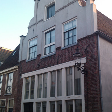 In aanleg mogelijk nog uit eind 16e, begin 17e eeuws daterend, fors uit twee bouwlichamen samengesteld, onderkelderd, aan drie zijden vrijliggend, schegvormig bouwblok, onder met pannen gedekte daken en voorzien van een in de tweede helft 19e eeuw aangebrachte bepleistering, 19e eeuwse winkelpui