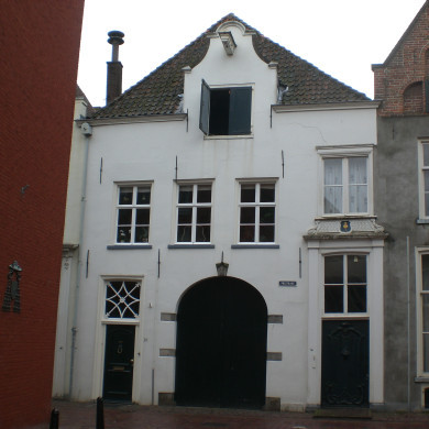 Breed pand met gepleisterde rechte gevel, in het midden een klokvormig verhoogd gedeelte, waarin hijsbalk en pakhuisluik. De gerestaureerde gevel heeft rechts een voordeur van groot formaat (rococosnijwerk), samen met een bovenlicht gevat in forse omlijsting en door een (nieuw) snijstuk gecombineerd met een bovenvenster. Links van de in het midden van de gevel geplaatste boogpoort een (nieuwe) voordeur met bovenlicht van kleiner schaal. XVIII-XIX.
