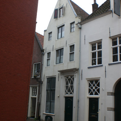 Onderkelderd huis met gepleisterde topgevel. Voordeuromlijsting met consoles en rococo-ornament; gesneden kalf en dito bovenlicht. Empire venster met gesneden middenstijl; geprofileerde natuurstenen dorpel. Getoogd kelderlicht. XVIII.