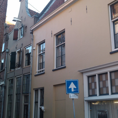Onderkelderd pand met getrapte tuitgevel, horizontaal geleed door bakstenen tandlijsten; de treden gedekt door geprofileerde natuurstenen platen. Ovaal vlieringvenster gevat in cartouche; vensters met natuurstenen dorpels en dito middenstijlen; ontlastingsbogen.