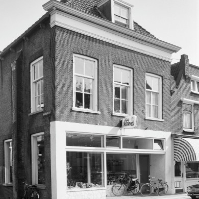 Markant hoekpand, begin 19e eeuw, met verdieping en schilddak. Eenvoudige lijstgevel, waarin vensters met zesruitsschuiframen.