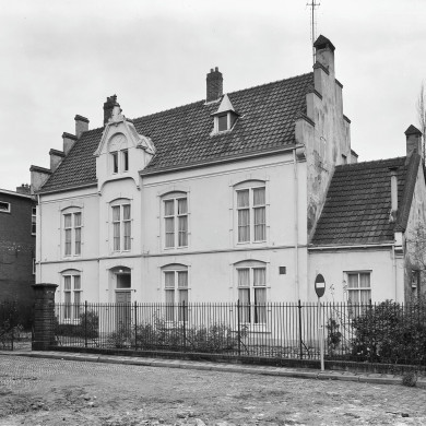 Laatgotisch huis van het Nederrijnse type met een der lange gevels aan de straat en een zadeldak tussen trapgevels met ezelsruggen. Hoekpand. De gevel is door een geprofileerd bakstenen waterlijst in een hoge begane-grond verdieping met insteek en een lage bovenverdieping verdeeld.