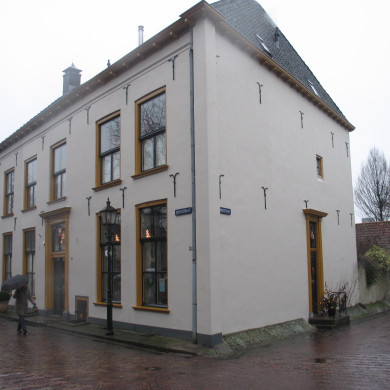 Hoekpand Bresstraat. Breed patriciershuis (XVIII) met zadeldak. Muurankers. Het huis dateert in oorsprong uit XVI. De gepleisterde gevel aan de Kosterstraat heeft geprofileerde vensterdorpels, een deurpartij met bovenlicht en pilasters, gesneden deur en Empireramen.