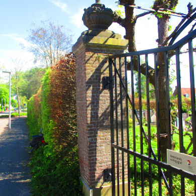 Hekpijlers van de R.K. begraafplaats, bekroond door Lod. XVI siervazen.