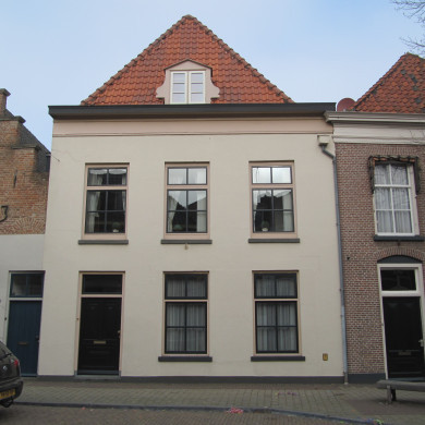 Pand met gepleisterde trapgevel, waarin jaartalankers, 1623, en in de top sieranker. Geprofileerde dekplaten op de trappen. De zolderverdieping heeft een venster met tweelichtskozijn, geflankeerd door twee smalle vensters met oude kozijnen.