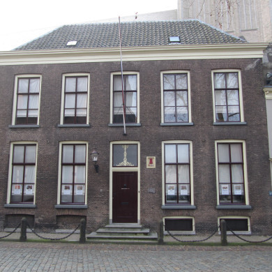 Pand met aan de achterzijde een gepleisterde gevel onder rechte lijst, dakkapel met fronton en muurankers. (XVI).