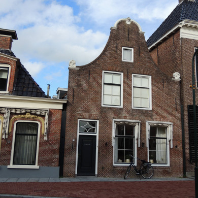 Deftig pand van vijf traveeën onder schilddak met hoekschoorstenen. De drie middelste traveeen als risaliet behandeld en bekroond door tympaan met snijwerk. Door halfzuilen omlijste ingang. Zes stoeppalen door kettingen verbonden.