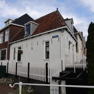 Hoekpand aan het water onder zadeldak, voor afgeschuind en van dakkapel voorzien.