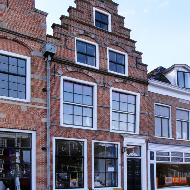 Vroeg 17e eeuws pand met verdieping onder zadeldak tussen trapgevel en puntgevel; boven langsgevel aan de Zijl eveneens grote trapvormige top met gewrongen pilasters. Gevel gedateerd 1622 doorregen met banden. Apotheek-pui gedragen op Ionische pilasters. In de toppen geprofileerde vensternissen.