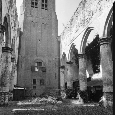 Ned. Herv. KERK. Laatgotische kruiskerk met driebeukig schip, herbouwd 1640-1644 - thans tot ruine vervallen, een dwarspand en een driezijdig gesloten koor uit omstreeks 1500. Gerestaureerd in 1930-1932, uitgezonderd het schip.