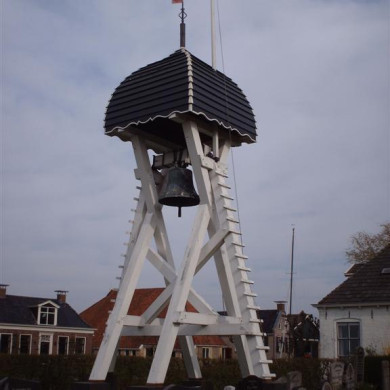Omheind kerkhof met klokkenstoel. Aan de Noordbroekstervaart staat op een omheind kerkhof een houten klokkenstoel met gebogen overhuiving, waarin klok van H. Wegewaert, 1600, diameter 108,5 centimeter.