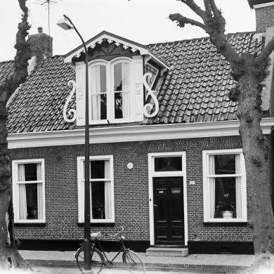 Gaaf pand zonder verdieping onder voor afgeschuind zadeldak, waarvoor houten dakkapel. Twee stoeppalen met kettingen.