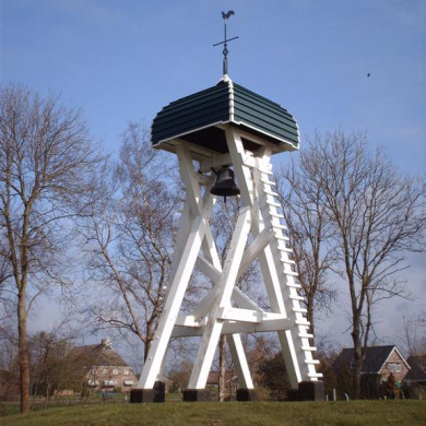 Klokkenstoel. Op een verhoogd door een gracht omgeven rond kerkhof staat een houten klokkenstoel met gebogen overhuiving. Klokkenstoel met klok van anonieme gieter?, 1340, diam. 78 cm.