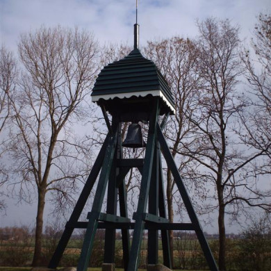 Klokkenstoel. Op een verhoogd door een gracht omgeven rond kerkhof staat een houten klokkenstoel met gebogen overhuiving. Klokkenstoel met klok van anonieme gieter?, 1340, diam. 78 cm.