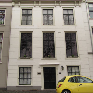 PAND met gepleisterde voorgevel, circa 1800, met Lodewijk XVI consoles onder de kroonlijst. Drie traveeën breed. Hardstenen deuromlijsting en Empire schuiframen.