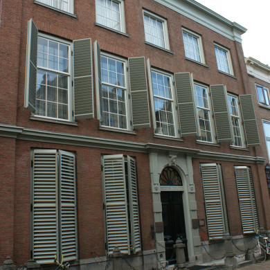 PAND met brede lijstgevel (XVIII b) van vier vensterassen, parterre met twee verdiepingen, middenrisaliet en hoekpilasters. Gepleisterd. In de risaliet raam- en deuromlijsting, Lodewijk XIV. Kroonlijst met gesneden consoles en schelpversiering in het midden.