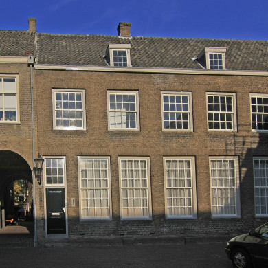 HOEKPAND Hofstraat. Huis van begane grond en verdieping (XVII a) onder zadeldak, oorspronkelijk tussen trapgevels, waarvan de westelijke door de aanbouw van een hoger 19e-eeuws pand verdwenen en de oostelijke tot een puntgevel met rollagen gewijzigd.