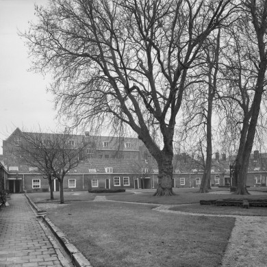 Op het uitgestrekte binnenplein een grasveld met hoog geboomte.
