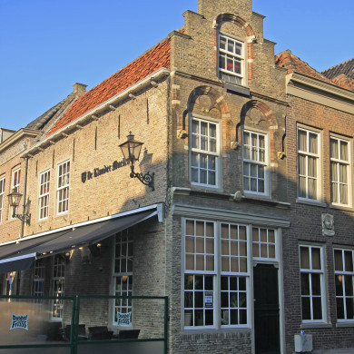 PAND met trapgevel met Ionische pilasters, friezen met metselmozaïek en geprofileerde dekplaten (XVII a). Goede pui (XVIII).