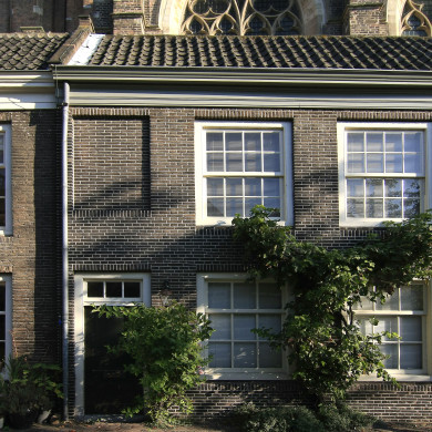 HUISJE, van parterre en verdieping onder een hoog zadeldak met de nrs 2, 3 en 4, tegen de zuidelijke zijbeuk van de Grote Kerk. Schuiframen stijl XVIII.