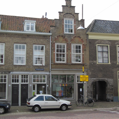 PAND met lijstgevel (XVIII), waarin geprofileerde, laat-gotische poort, die toegang geeft tot het Hof.