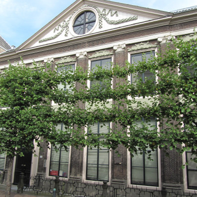 Monumentale lijstgevel (XIX b), gepleisterd, voor HUIS (XVII). Breedte: zeven vensterassen. Middenrisaliet met driehoekig fronton, waarin klok, omringd door Empire acanthusornament. Balkon met balustrade op houten, Ionische zuilen met in het fries snijwerk.