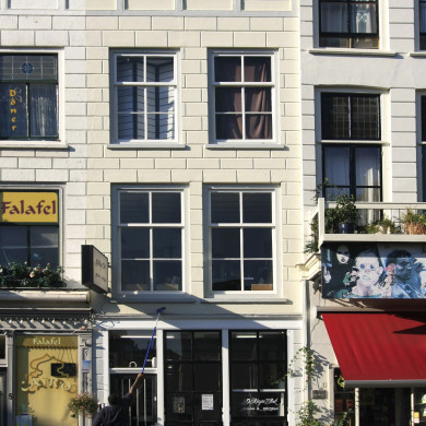 HOEKPAND Groenmarkt. Lijstgevel, gepleisterd (XVIII). Empire schuiframen.