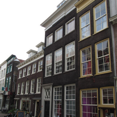 Aan de Voorstraatshaven gepleisterde gevel onder rechte lijst.