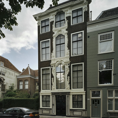 PAND met zeer rijk versierde Lodewijk XIV gevel met middenrisaliet. Natuurstenen pui, waarin deuromlijsting met verdiepte pilasters, fijn gesneden bladfries als afsluiting, oorspronkelijke deur en bovenlicht. De risaliet heeft rond het parterrevenster voluten, siervazen en hermen, om de verdiepingsvensters voluten, siervazen en guirlandes. Geprofileerde, omgekorniste kroonlijst, aan weerszijden door gebeeldhouwde consoles gedragen. Alle vensters Empire schuiframen. Het huis heeft een schilddak.