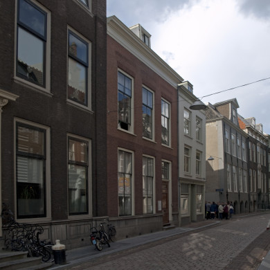 PAND met bakstenen lijstgevel (XVIII b) met middenrisaliet en hoekpilasters. Breedte vijf vensterassen. Hardstenen plint, eenvoudige houten omlijsting van deur en vensters middenvak, consoles onder de kroonlijst Lodewijk XIV. In de bovenverdieping schuiframen (XIX a).