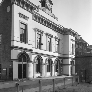 Openbare LEESZAAL. Late Empire gevel, gedateerd 1841. Indrukwekkende, gepleisterde lijstgevel met zijrisalieten, hardstenen plint, banden, waterlijst, pilasters en vensterdorpels. Vensters parterre getoogd, vensters verdieping met hoofdgestellen. De lijst wordt gedragen door gesneden consoles. In de verdieping nog de oorspronkelijke schuiframen.