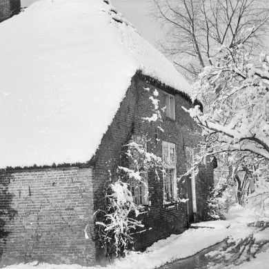 Boerderij van het Langstraatse dwarsdeeltype, onder rieten wolfdak; ramen met kleine roedenverdeling en luiken; afzonderlijke schuur van hout en riet onder rieten wolfdak; afzonderlijke bakstenen schuur onder rieten wolfdak.