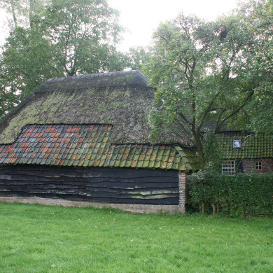 17e eeuwse boerderij onder met riet en pannen gedekt schilddak, dat aan de achterzijde is afgewolfd. Hoekhuis van het kortgeveltype met dwarsdeel. Vensterkozijnen, waaronder een kruiskozijn, en luiken bij de restauratie in 1973-1974 in de oorspronkelijke vorm hersteld.