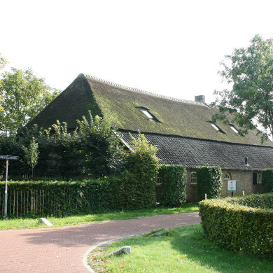 18e eeuwse boerderij onder met riet en pannen gedekt wolfdak. Vensters met kleine roedenverdeling.