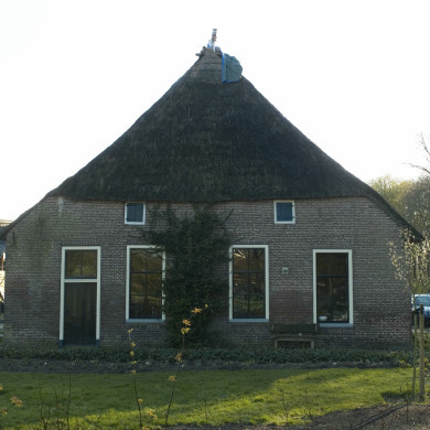 Eenvoudige 19e eeuwse BOERDERIJ van het dwarsdeeltype op rechthoekige plattegrond. Woon- en bedrijfsgedeelte worden gedekt door een aan voor- en achterzijde afgewolfd zadeldak met uilebord, het woonhuisgedeelte is deels met pannen belegd; topschoorsteen.