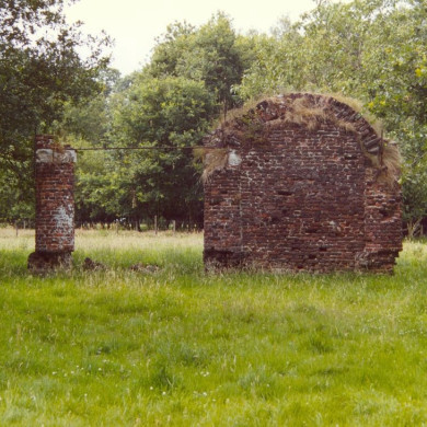 Drie ronde, door segmenten verbonden bakstenen pijlers. Een der openingen is dichtgemetseld. XVI of XVII: Overblijfsels van het kasteel Annendaal.