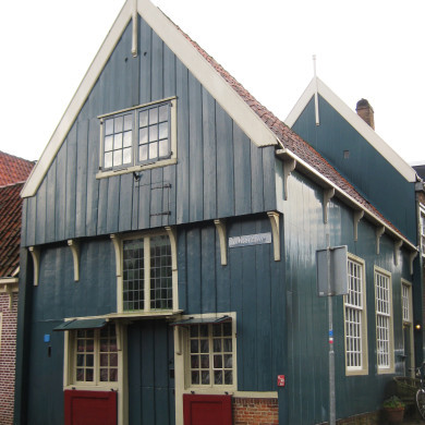 Houten huis, XVI A, met een overkraagde puntgevel op consoles boven een onderpui met gekoppelde deur-, venster- en bovenlichtkozijnen.