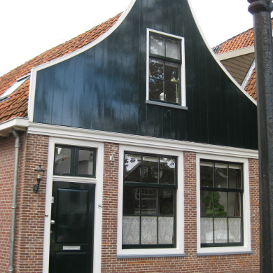 Huis met houten topgevel. Oorspronkelijk kozijnen.