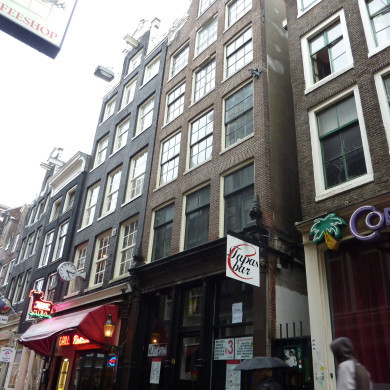 Pand met ingezwenkte halsgevel (1735) met bijzondere top: gedeelde randprofielen, volutenafdekking waarin het jaartal en topvaas. Op bovenste verdiepingen goede roedenverdeling. Steen met 1735 ook in de zijgevel.