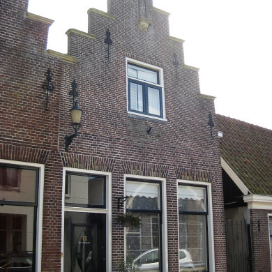 Huizen met gekoppelde voorgevels, XVIIa, waarvan de trapgevel rechts is behouden maar de linkergevel thans de vorm heeft van een puntgevel. Rechts getoogde zolderdeurkozijnen met bovenlicht: strokendeur. Bogen boven de zolderopeningen met gele baksteen verlevendigd. Puien gewijzigd.