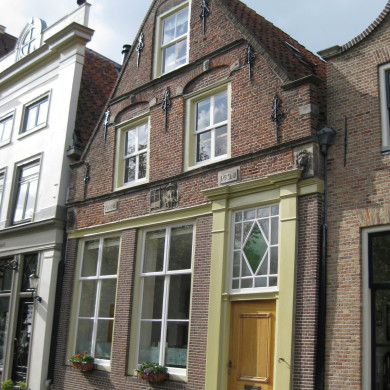 Huis met puntgevel, oorspronkelijk trapgevel. In het fries leeuwenmaskers, een gevelsteen met voorstelling van een olieslagerij en twee steentjes met ANNO 1628. Vensterbogen met maskersluitstenen. Pui XIXa. Ingang met bovenlicht tussen pilasters.