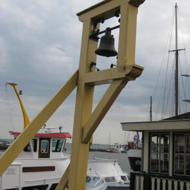 Een eenvoudig houten klokkestoel met de Trouwklok 1771.