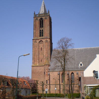 Toren van de Hervormde Kerk. Forse toren, 1521. Mechanische torenuurwerk, 1901, Frans fabrikaat.