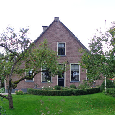 Boerderij van het langhuistype, met door verbouwing ontstane onregelmatige kopgevel, met vlechtingen gemetseld. Aan weerszijden van de voordeur zesruits-schuifvensters met luiken behangen. Rechts een gedeelte met opkamer. Met riet gedekt.