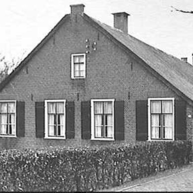 Boerderij van het langhuistype, lage topgevel, 1865 in ankers gedateerd, met vlechtingen gemetseld en 9-ruitsschuiframen.