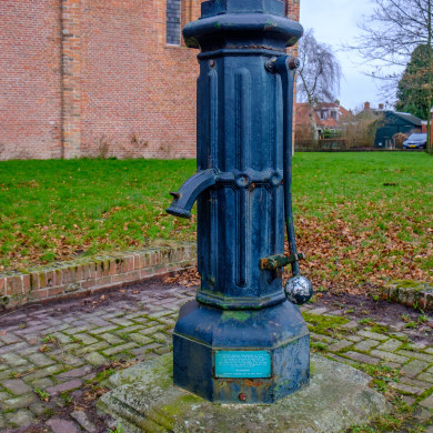Gietijzeren pomp. Op het achthoekig pomplichaam, dat door middel van een geprofileerde rand op een achthoekige basis staat, zijn geprofileerde ribben aangebracht.