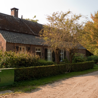 Brabantse langgevelboerderij, eerste helft negentiende eeuw. Met riet en pannen gedekt wolfdak. Vensters met luiken en zesruitsschuiframen.